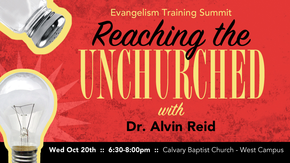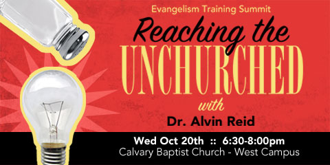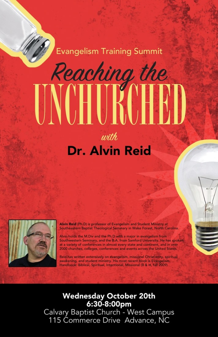 We are looking forward to having Dr. Alvin Reid with us at Calvary West in Advance N.C. (On the edge of Winston-Salem, right off of I-40) for an evangelism training summit. This will be a great opportunity to come and hear Dr. Reid teach on “reaching the unchurched.” Everyone is welcome, spread the word and join us!