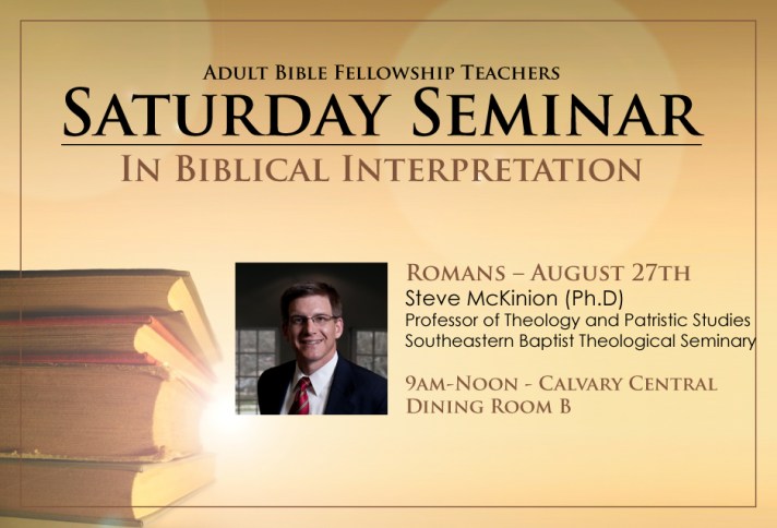 On August 27th we will have our 3rd Saturday Seminar in Biblical Interpretation on the book of Romans with Dr. Steve McKinion from Southeastern Baptist Theological Seminary, where he serves as a Associate Professor of Theology and Patristic Studies. Here is a little background information on Dr. McKinion from his personal website.