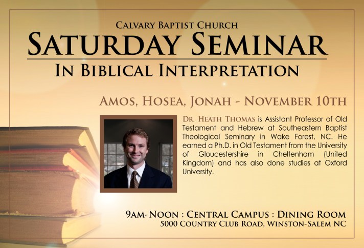 It’s time for another Saturday Seminar at Calvary! If you are a Bible Fellowship teacher, part of a Bible Fellowship teaching team, or just love to study the bible, you will not want to miss this training opportunity to learn from one of our Southeastern Baptist Theological Seminary professors! Dr. Heath Thomas will be at Calvary Central Campus on Saturday, November 10th from 9am-12noon. Dr. Thomas will be walking us through Amos, Hosea, and Jonah.